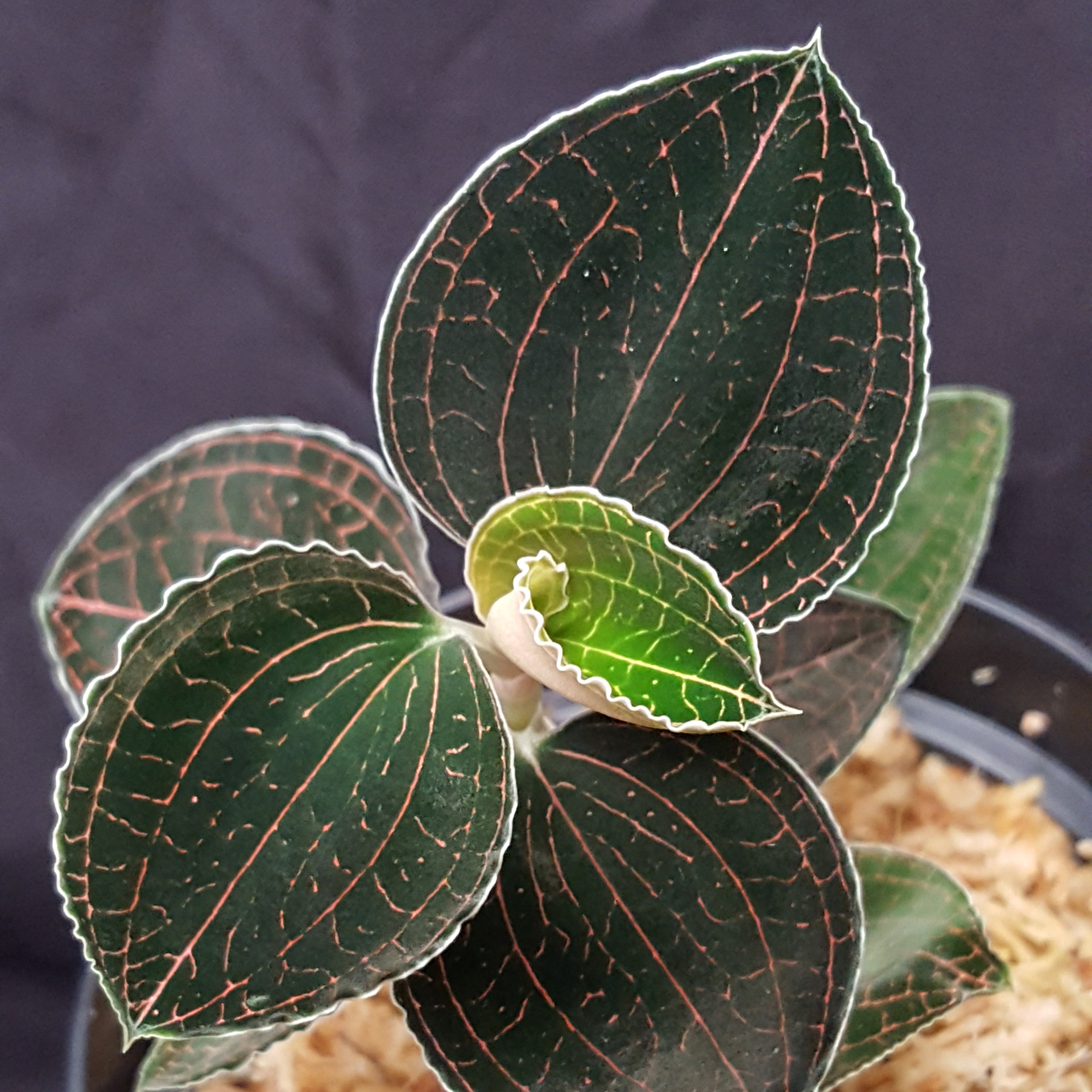 Reddish veins run through the dark, almost black leaves of the small Anoectochilus brevilabris ‘White Veil’ Lindl. 1840, creating a beautiful contrast. It is found in the eastern Himalayas, in Bhutan and in India in Assam. This Asian jewel orchid feels at home in temperatures that you also feel comfortable in. It thrives in the shade of forests and is therefore perfectly adapted to low light conditions. Direct sunlight is detrimental to it and leads to bleaching of the leaves. The roots must grow in a well-aerated, constantly moist substrate. Waterlogging is very likely to kill it. Please also fertilise sparingly and only use rainwater for watering if possible. The pictures shown are examples, the plant you purchase is similar to the pictures.