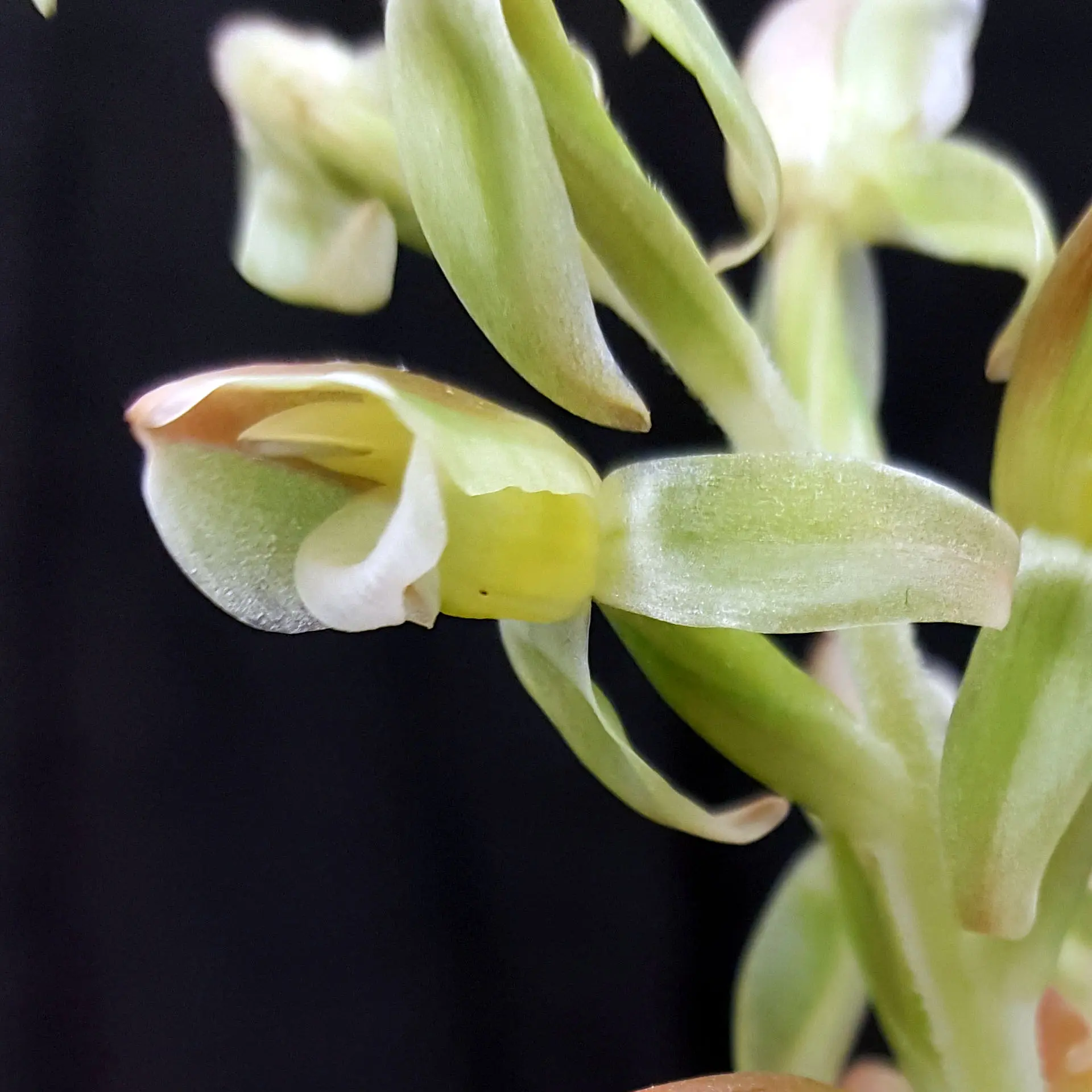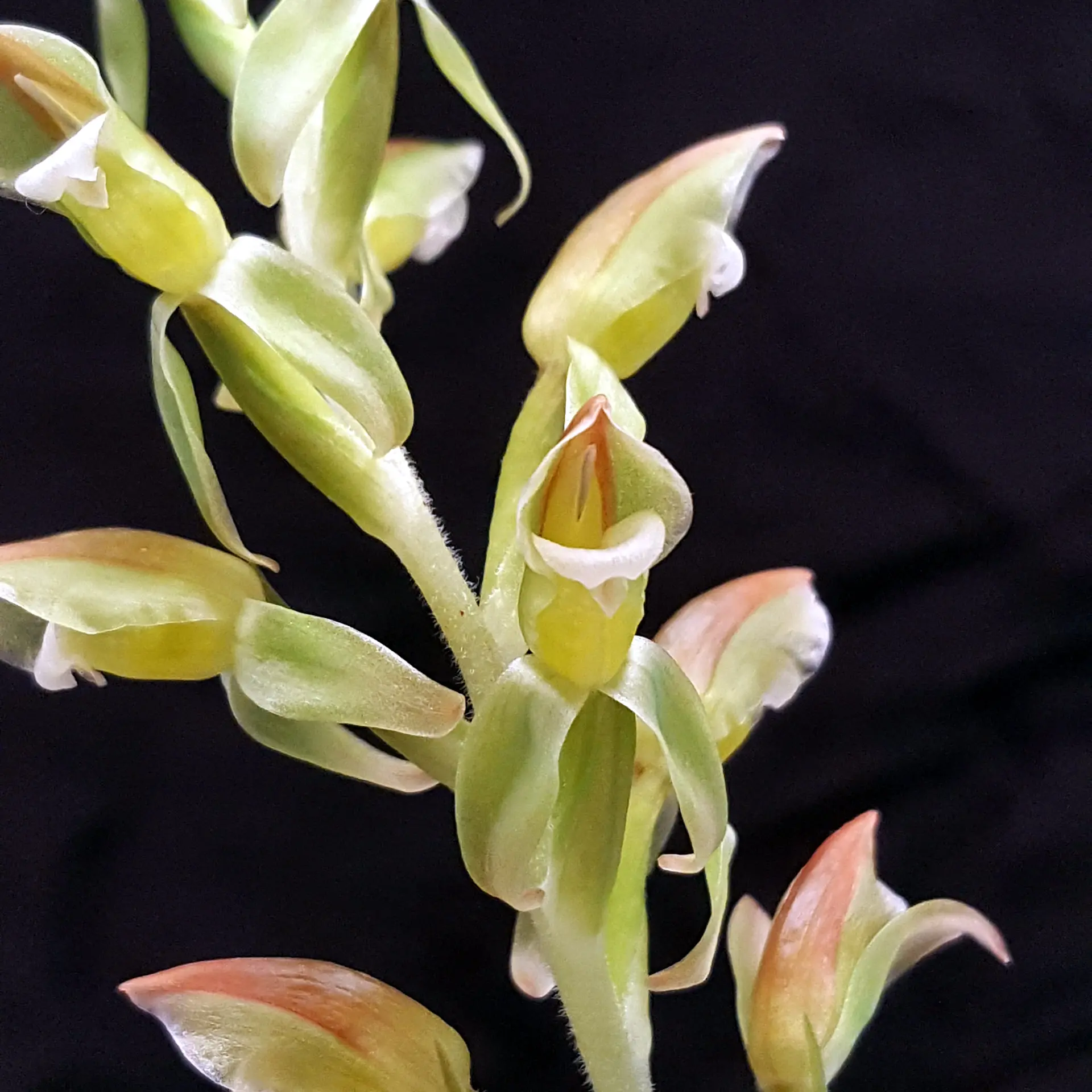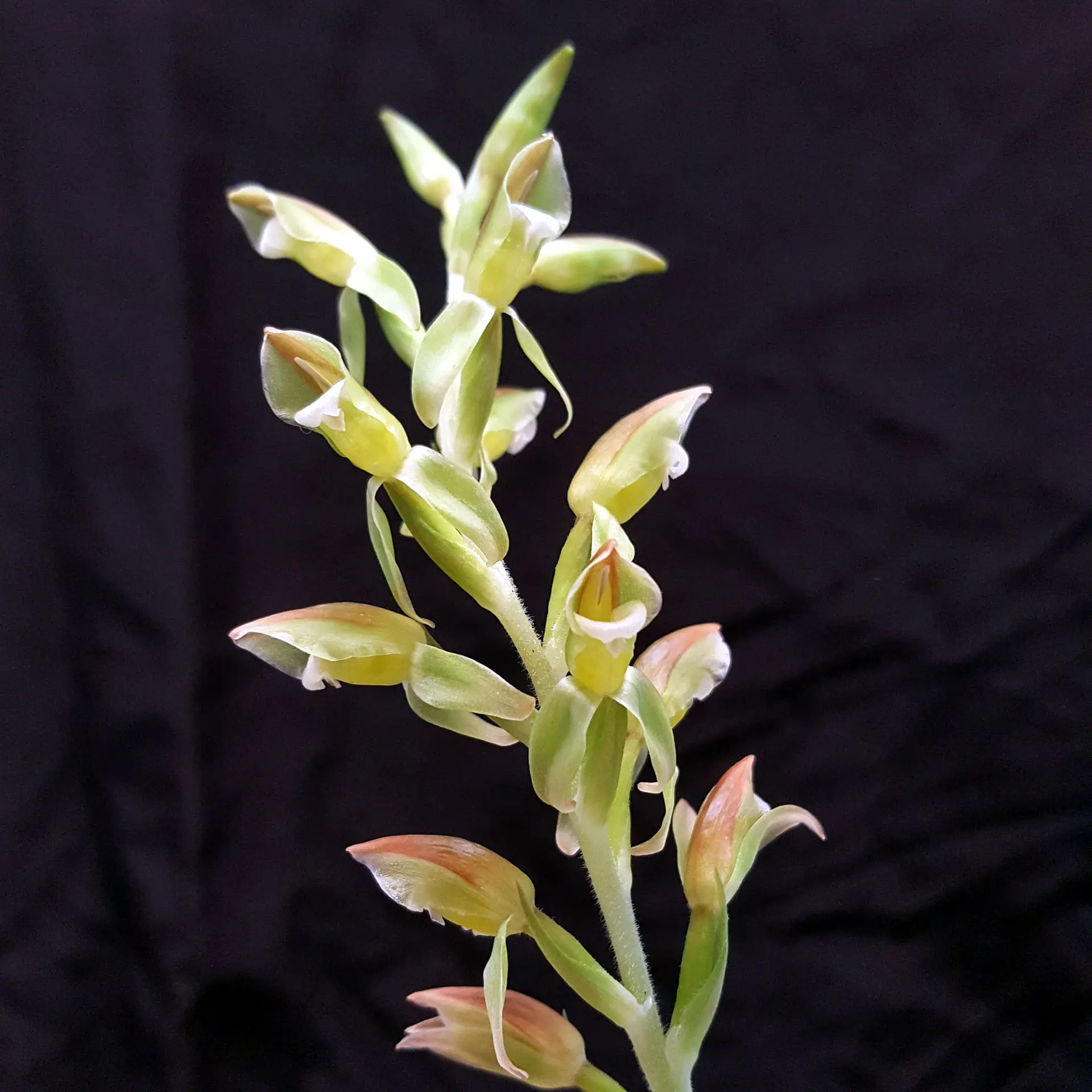 Goodyera viridiflora ‘Surprise’ (Blume) Blume 1858 has been known for a long time, but is rarely cultivated, even though it is easy to grow. This is reflected in its wide distribution area. The surprisingly large flowers of this jewel orchid are the main reason for its popularity. Up to 20 flowers can be found on one inflorescence. The large flowers are all the more astonishing as Goodyera flowers are normally very small. We cultivate them at room temperature, keep the substrate moderately moist and fertilise with fertiliser sticks. Direct sunlight should also be avoided with this jewel orchid. Its stem creeps on the substrate and sprouts new roots at the internodes, whereas the younger part of the Goodyera viridiflora stands upright. The pictures serve as an example, you are buying a similar plant.