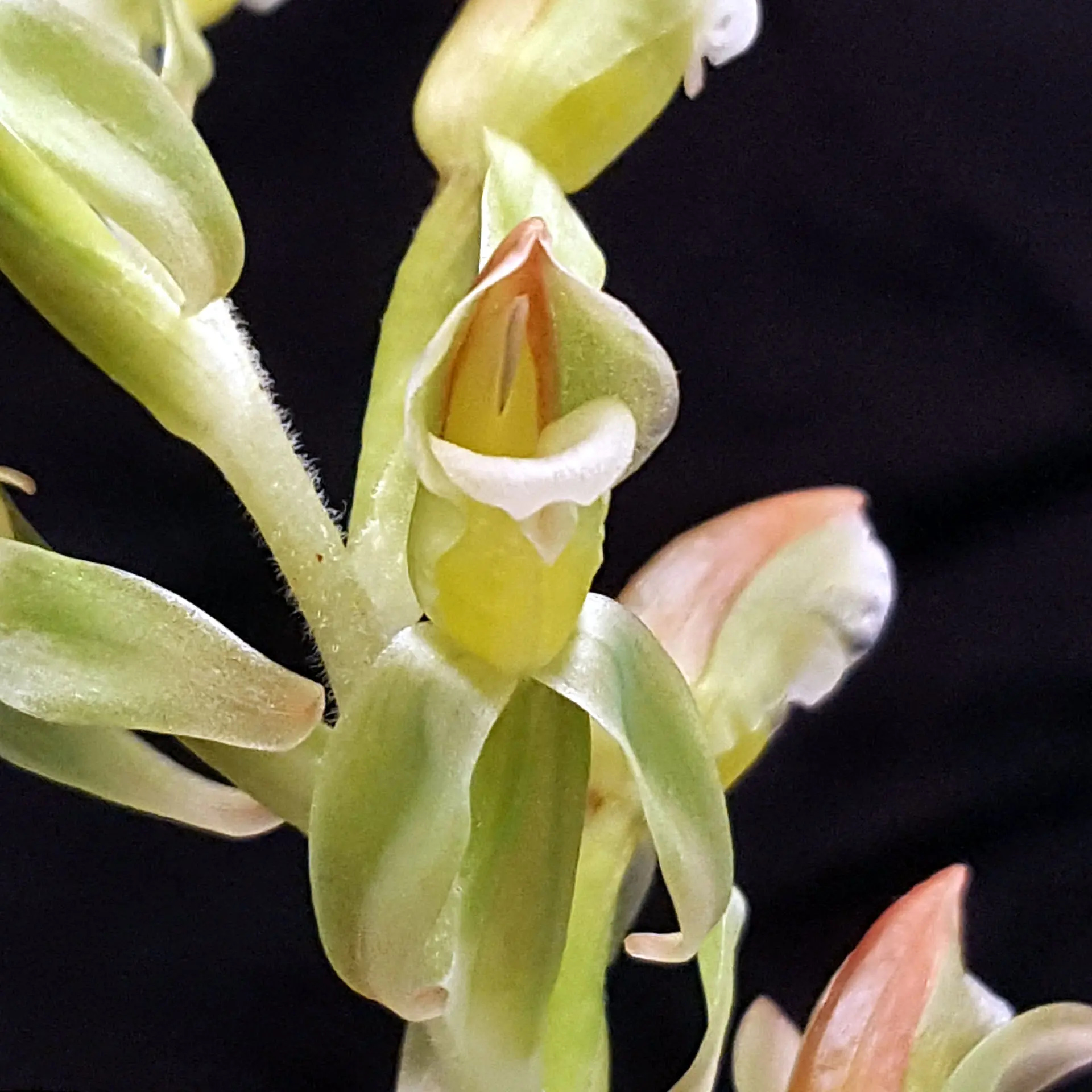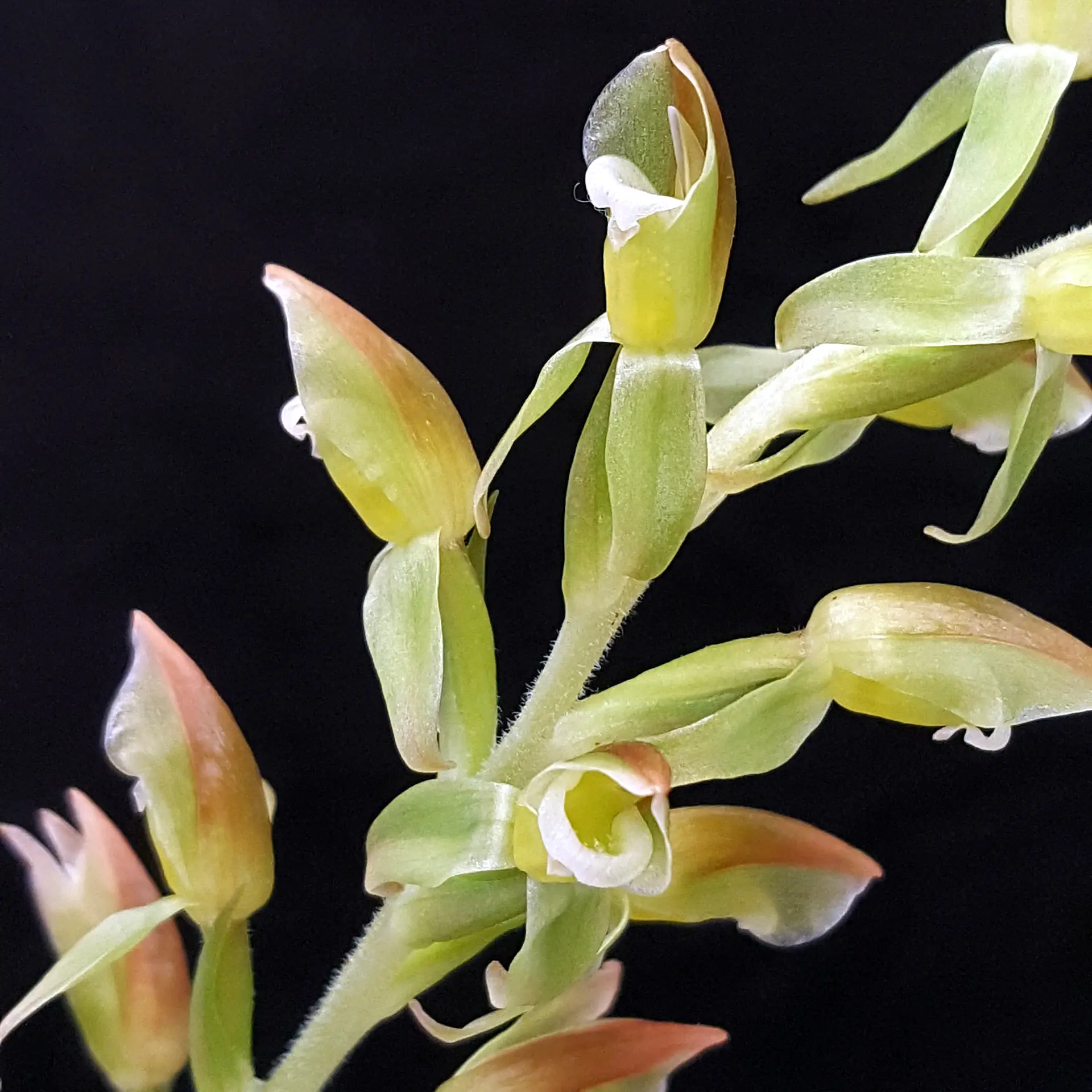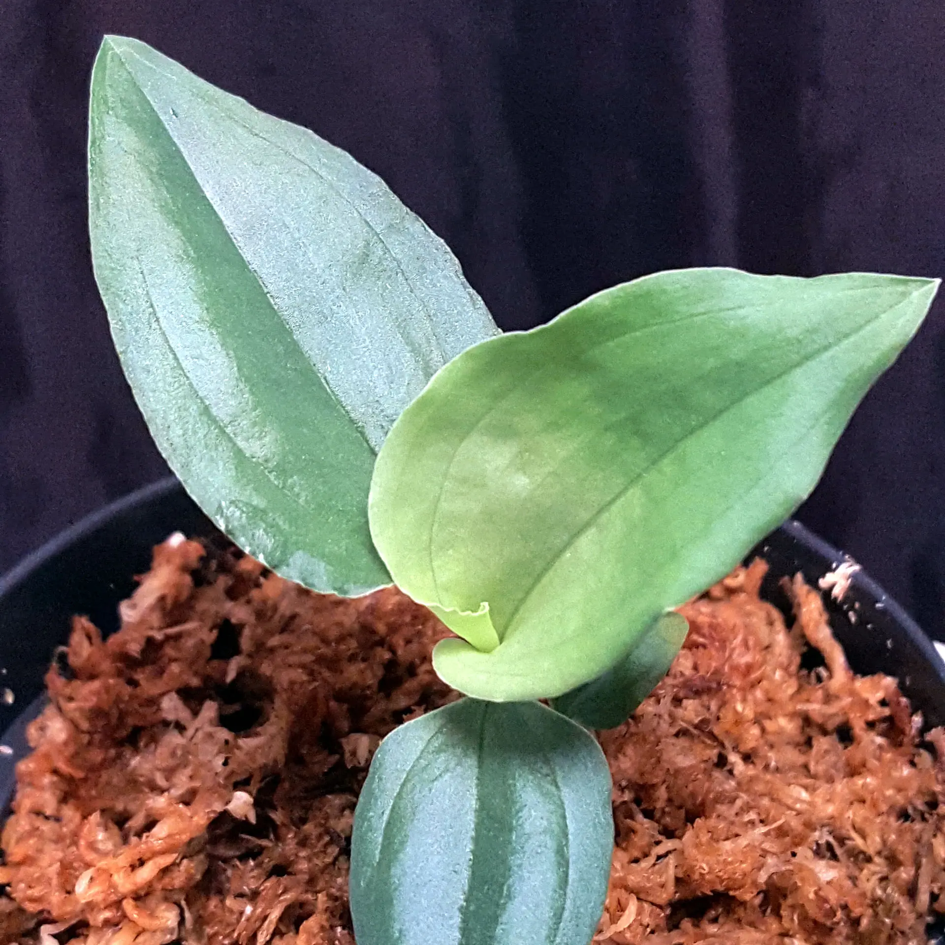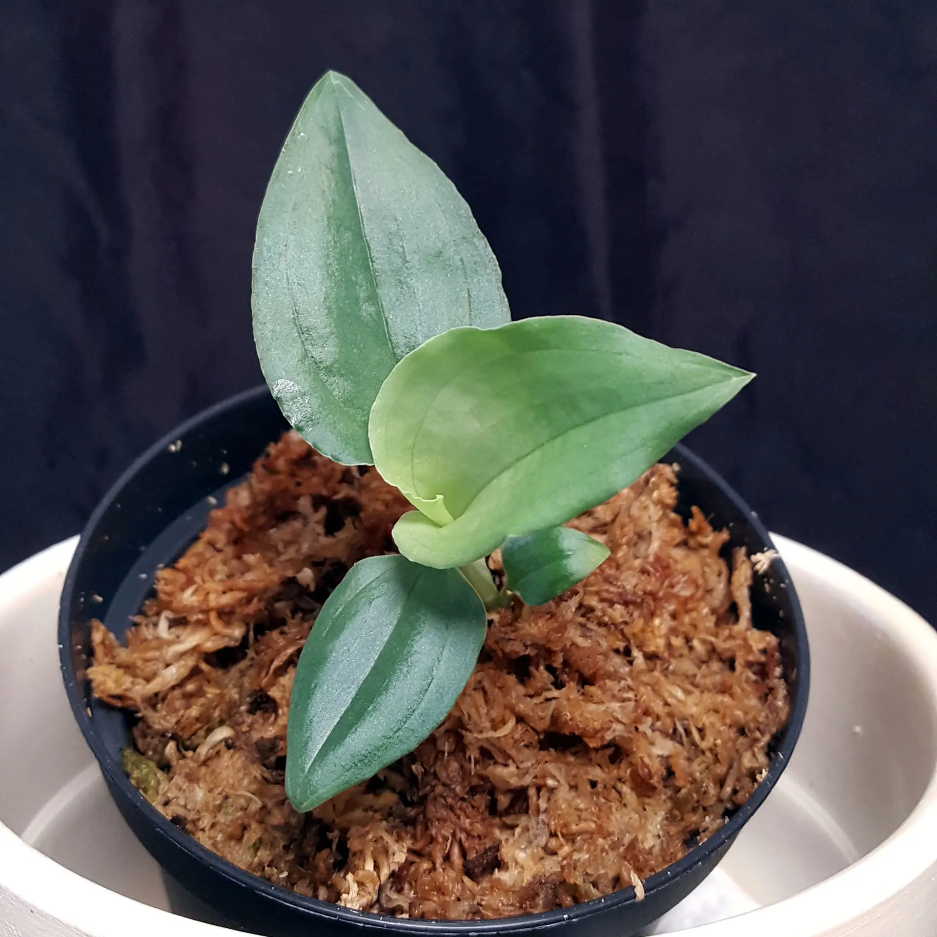Goodyera viridiflora ‘Surprise’ (Blume) Blume 1858 has been known for a long time, but is rarely cultivated, even though it is easy to grow. This is reflected in its wide distribution area. The surprisingly large flowers of this jewel orchid are the main reason for its popularity. Up to 20 flowers can be found on one inflorescence. The large flowers are all the more astonishing as Goodyera flowers are normally very small. We cultivate them at room temperature, keep the substrate moderately moist and fertilise with fertiliser sticks. Direct sunlight should also be avoided with this jewel orchid. Its stem creeps on the substrate and sprouts new roots at the internodes, whereas the younger part of the Goodyera viridiflora stands upright. The pictures serve as an example, you are buying a similar plant.